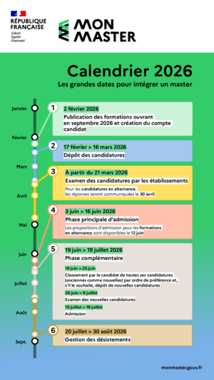 02/2026 | Dès le 2 février, retrouvez l’offre de master mise à jour et constituez votre dossier candidat commun à toutes vos candidatures. Le dépôt des candidatures ouvre le 17/02/2026 sur monmaster.gouv.fr